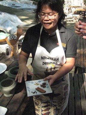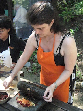 It was great fun, and the four of us in the group took turns to take the meat out of the coconut, smoke the banana leaves to make them flexible, and grind the sambal paste from garlic, galangal, ginger, onion, lemon grass, red chilis and fish meal.