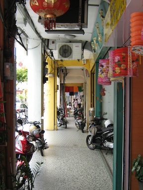 After not more than twenty minutes, a ferry arrived, so we boarded and sailed off across the calm waters of the Penang Strait. In the distance we could see a cruise ship pulling out of Georgetown. Small dhows behind us on Butterworth beach were festooned with red flashing LED lights in addition to their regular navigation lights, and this combined with a plethora of shore lights must make the otherwise dark Strait quite tricky to navigate. However our little ferry made it to Georgetown in just over quarter of an hour without any problems, and we disembarked. Randomly choosing a road to walk up, we skipped a number of rather dodgy looking hostels until we found a pretty little hotel set back from the street. It was absolutely beautiful inside, and only $75 a night, a little pricey for Malaysia but dirt cheap for us.