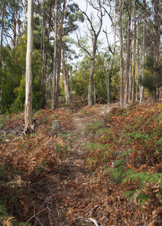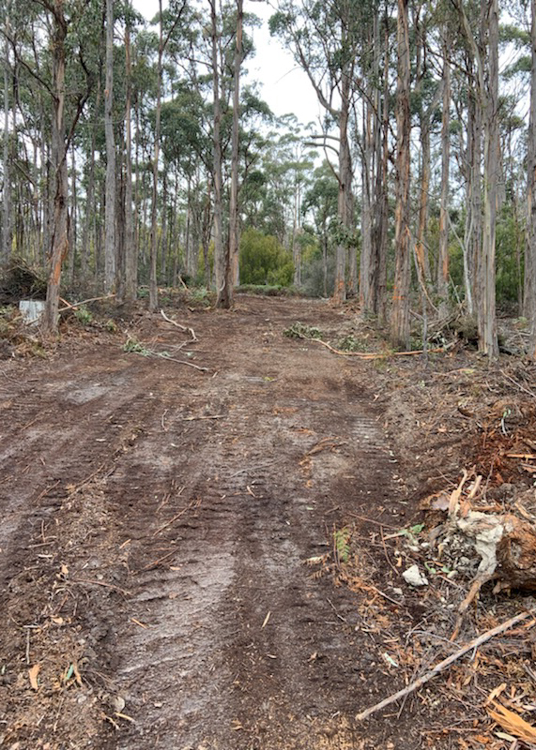 Back in 2012, we asked Matthew, a friend and neighbour who had access to useful machinery, if he would help us with bulldozing a road into our property. We asked him to make it as subtle as possible, just a winding bush-track through the forest to give us initial access, without materially changing the look and feel of the site. Matthew made us just what we wanted, a dirt track just perfect for humping camping gear in and out of the forest.