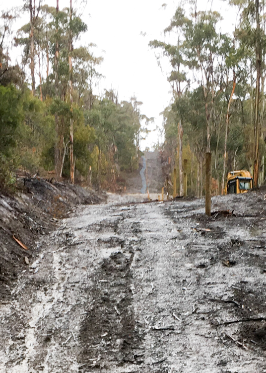 Doing our research and due diligence, I became aware that the Rural Fire Service regulations had changed. When we’d put in our original access track, the requirement had been a maximum slope of 1 in 4; now the legislation had been upgraded to no steeper than 1 in 5.5 and at least 4 metres wide. Before we would be permitted to live in any planned house, we needed to build a new road.