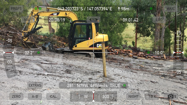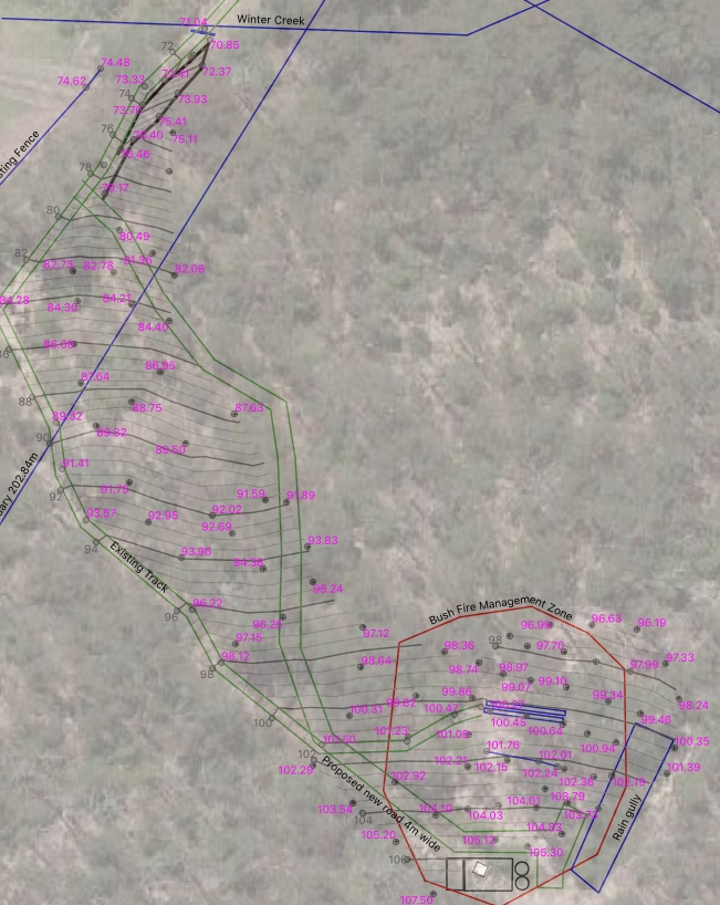 Poring over the numbers, I mapped out a potential contour route for an access road that would meet fire regulations, would be strong and wide enough to take heavy construction vehicles, and yet wouldn’t spoil the feeling of arriving at a remote bush block. In the 2019 site plan to the right above, you can see the wide green road skirting the Easterly limit of the contour lines.