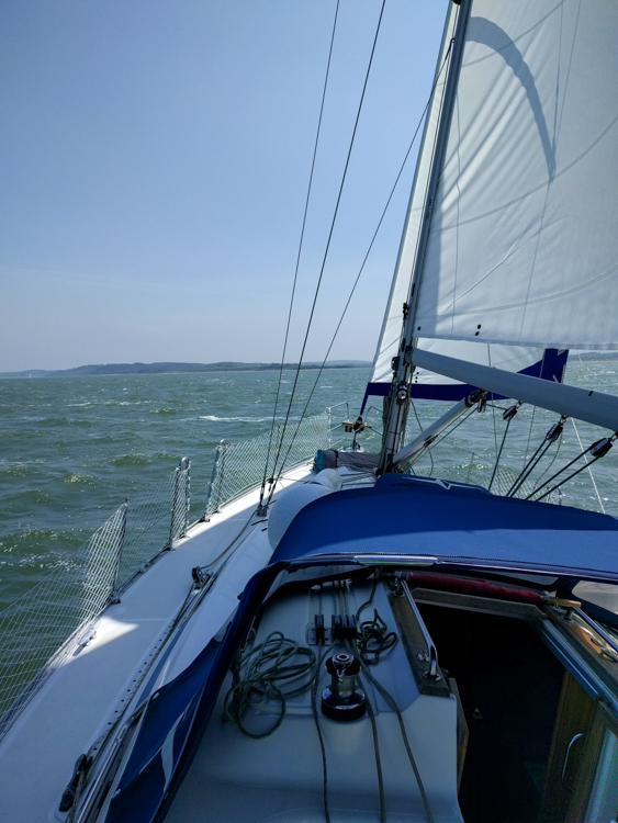It looks like it should be possible to address this by either refurling the sail in the opposite direction (although we’d need to get the UV strip re-stitched onto the other side), or perhaps by fitting deck hardware on the other side of the boat. Still, it is already greatly improved.